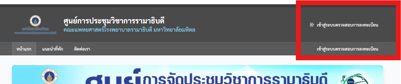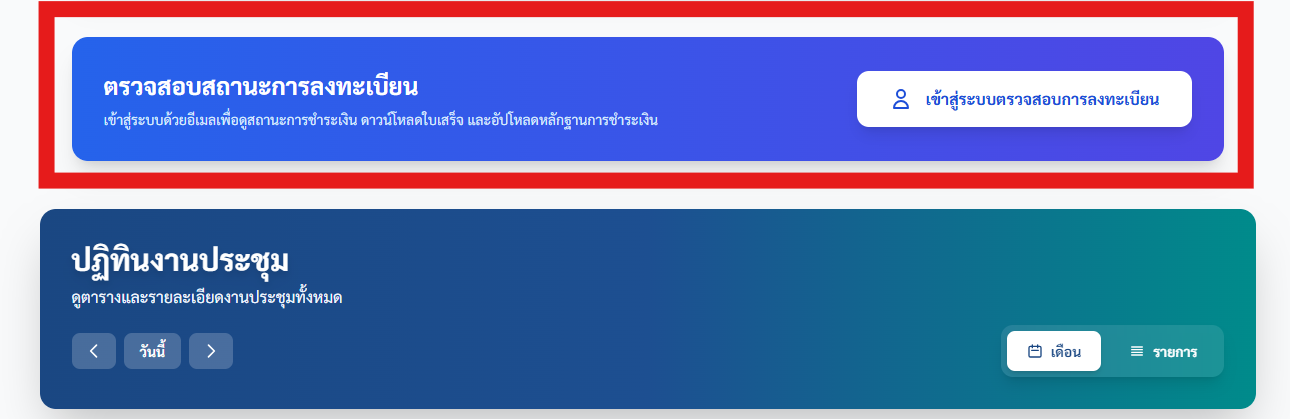 ไปที่หน้ารายการงานประชุม เลือกงานประชุมที่ต้องการ จากนั้นเลือก ประเภทการลงทะเบียน ที่งานประชุมนั้นกำลังเปิดอยู่