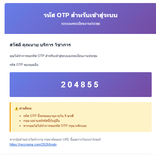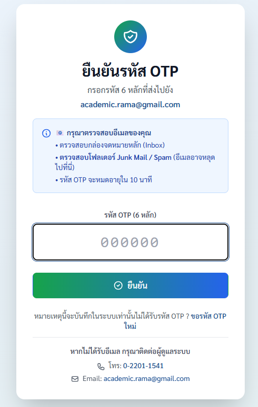 ระบบจะส่งรหัส OTP 6 หลักไปยังอีเมลที่กรอก — รหัสมีอายุ 10 นาที