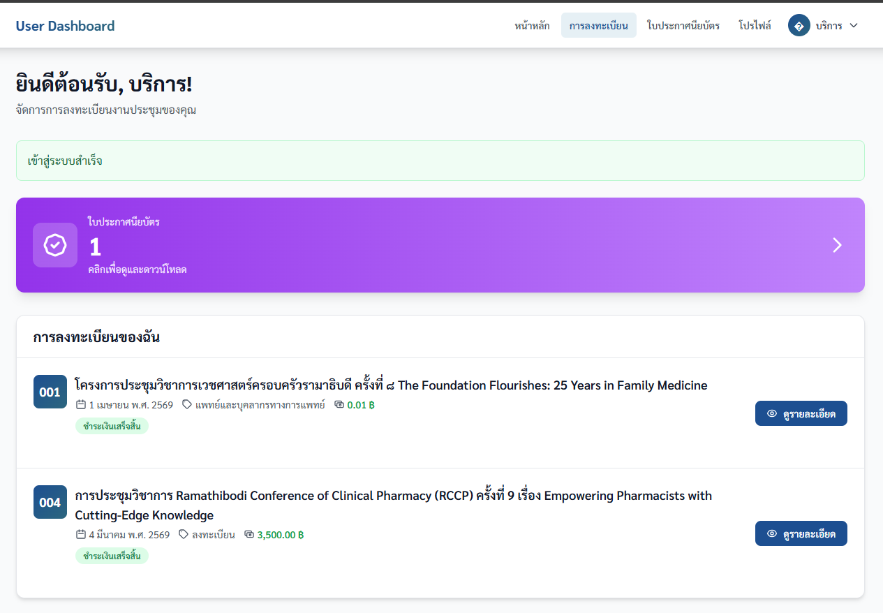 - รายการลงทะเบียนทั้งหมดพร้อม ชื่องาน / ประเภท / ค่าลงทะเบียน / สถานะ