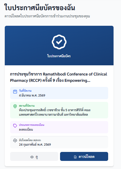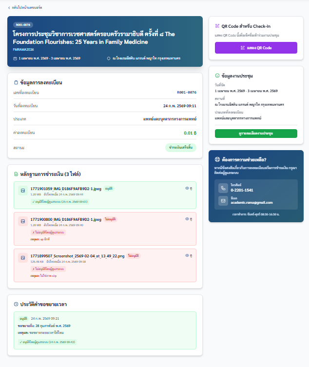 💡 เคล็ดลับ: เมื่อชำระเงินเสร็จสิ้นแล้ว สามารถแสดง QR Code สำหรับลงทะเบียนเข้างานวันจริงได้จาก Dashboard โดยไม่ต้องพิมพ์เอกสาร