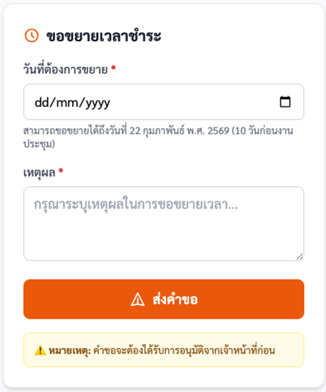 เลือก วันที่ใหม่ที่สามารถชำระได้ และกรอก เหตุผล ให้ชัดเจน แล้วกด "ส่งคำขอ"