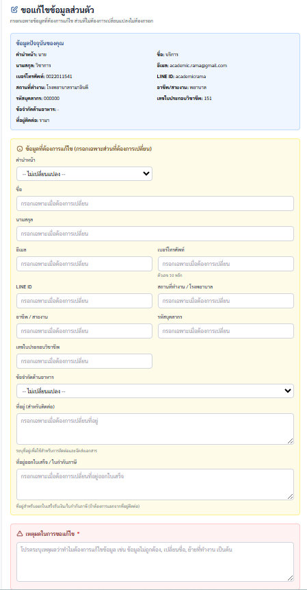 ระบุข้อมูลที่ต้องการแก้ไข (ชื่อ, หน่วยงาน ฯลฯ) พร้อมข้อมูลที่ถูกต้องและเหตุผล