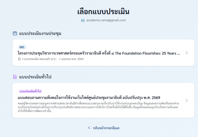 คลิกลิงก์แบบประเมินจากหน้าลงทะเบียนสำเร็จ — โดยจะเป็นแบบประเมินที่เกี่ยวข้องกับตัวเว็บไซต์ หรือ แบบประเมินทั่วไปเท่านั้น