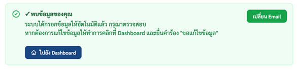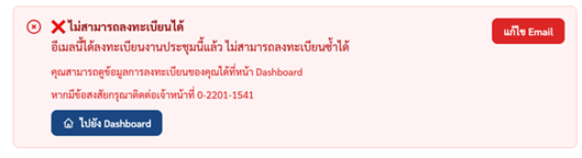 ไม่สามารถลงทะเบียนซ้ำได้ — ระบบจะแสดงปุ่มไปยังหน้า Dashboard เพื่อดูรายละเอียดการลงทะเบียนเดิม