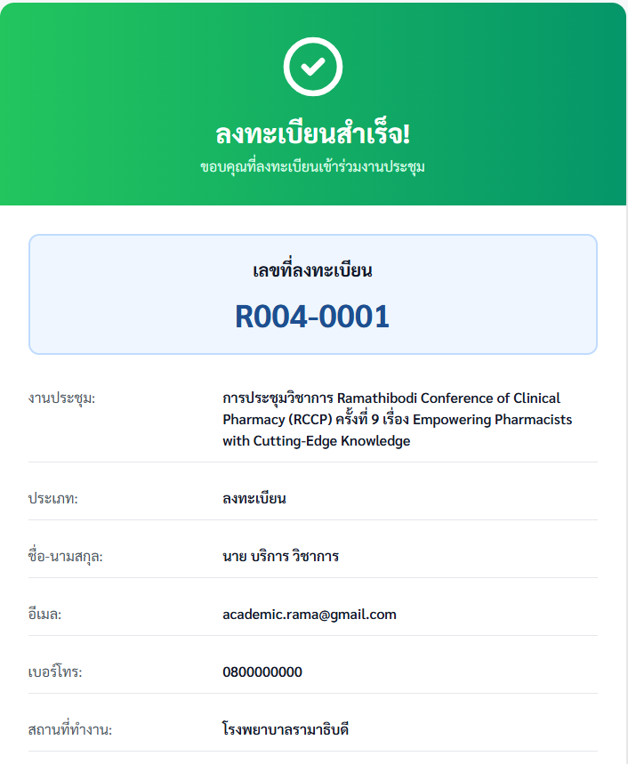 หน้า "ลงทะเบียนสำเร็จ" จะแสดงข้อมูลทั้งหมดในหน้าเดียว