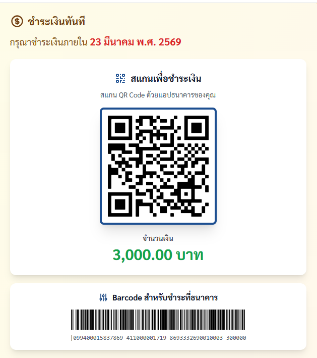 - QR Code และ Barcode สำหรับชำระเงิน (กรณีมีค่าลงทะเบียน)