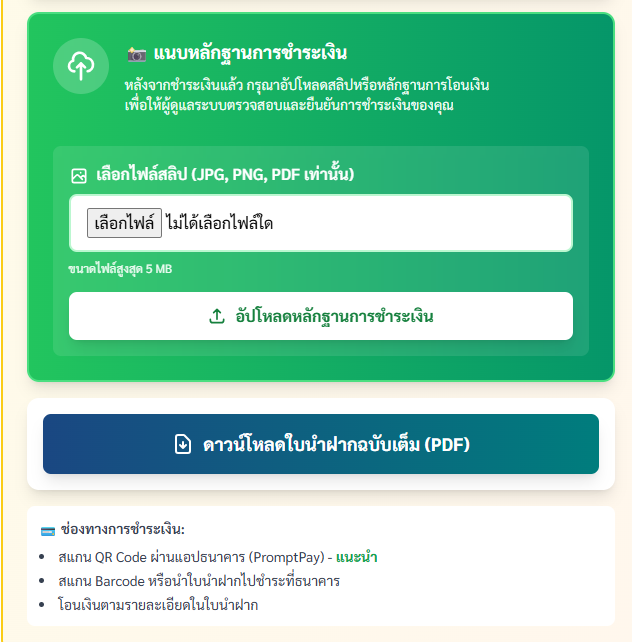 - ฟอร์มแนบหลักฐานการชำระเงิน — สามารถอัปโหลดหลักฐานชำระเงินได้ทันทีในหน้านี้
