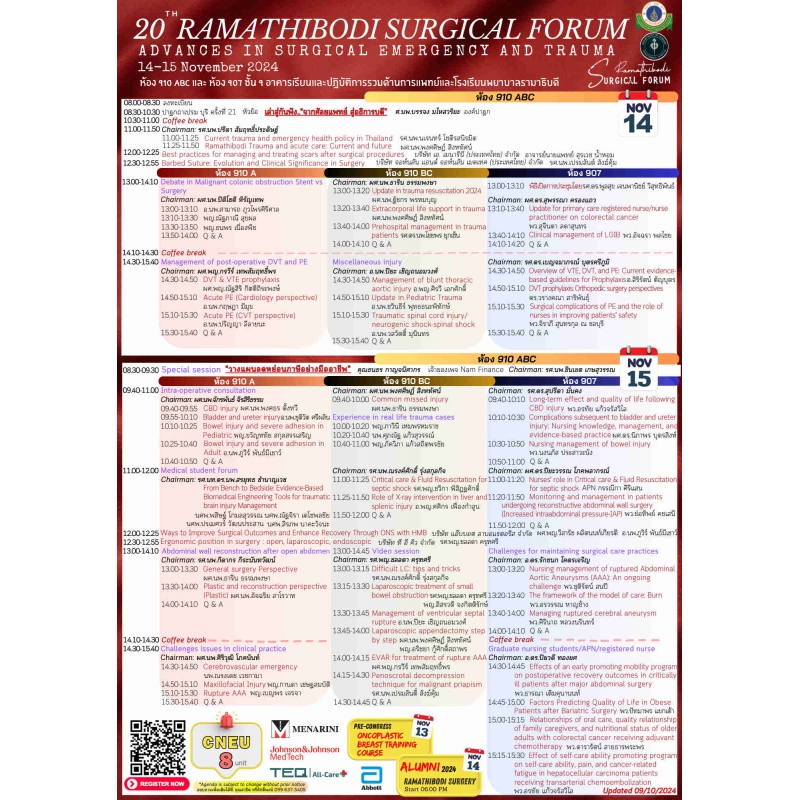 โครงการให้ความรู้ต่อเนื่อง (continuous medical education) ให้แก่ แพทย์ประจำบ้าน แพทย์ประจำบ้านต่อยอด ศัลยแพทย์ทุกสาขา แพทย์ทั่วไป พยาบาล ตลอดจนบุคลากรทางด้านสาธารณสุขในปีนี้เป็นการจัดงานปาฐกถาเปรม บุรี ครั้งที่ 21 และโครงการประชุมวิชาการ 20th Ramathibodi Surgical Forum หัวข้อ “Advances in Surgical Emergency and Trauma” ซึ่งได้กำหนดหัวข้อการประชุมให้สอดคล้องกับบริบทในระบบบริการดูแลรักษาผู้ป่วยด้านอุบัติเหตุแบบฉุกเฉินในขั้นสูง ที่จำเป็นต้องได้รับการรักษาพยาบาล นับว่าเป็นการประชุมวิชาการอย่างเป็นทางการเพื่อเป็นการพัฒนาองค์ความรู้ที่น่าสนใจ อันจะเกิดประโยชน์ไม่เฉพาะต่อศัลยแพทย์เท่านั้น แต่จะเกิดประโยชน์อย่างยิ่งต่อบุคลากรทางสาธารณสุขที่ต้องปฏิบัติงานร่วมกันแบบสหสาขาในการรักษาผู้ป่วยต่อไป