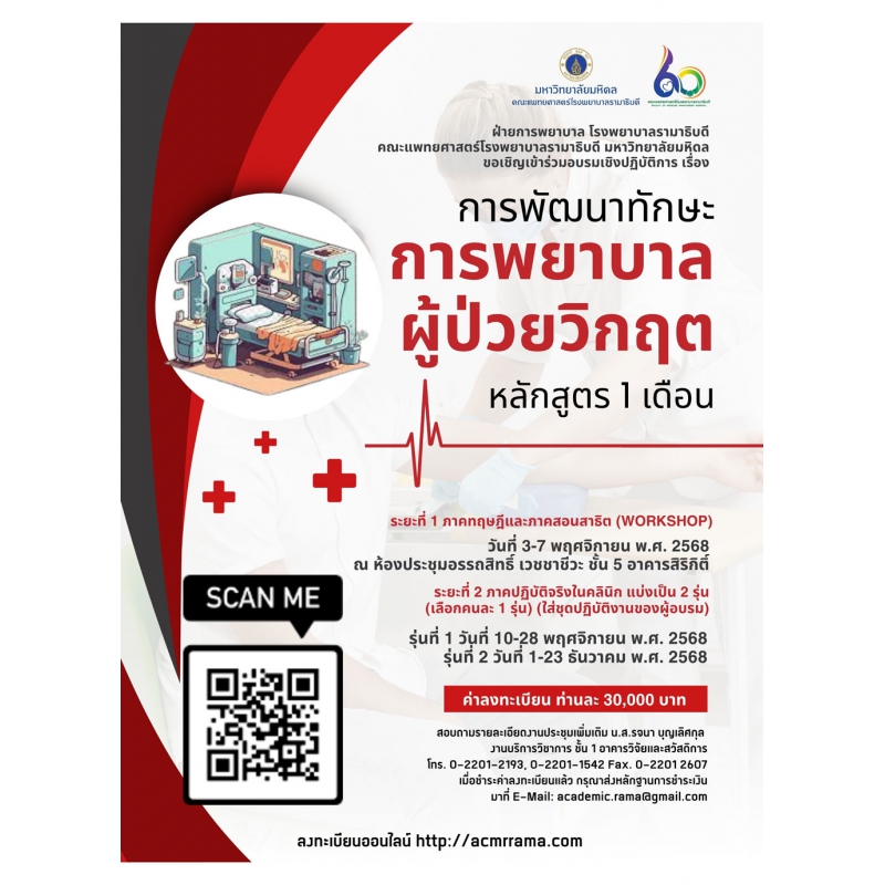 คณะอนุกรรมการผู้ป่วยวิกฤต ฝ่ายการพยาบาลโรงพยาบาลรามาธิบดี คณะแพทยศาสตร์โรงพยาบาลรามาธิบดี เห็นความสำคัญดังกล่าวจึงจัดการอบรม เชิงปฏิบัติการในครั้งนี้ มีวัตถุประสงค์เพื่อพัฒนาศักยภาพพยาบาลที่ดูแลผู้ป่วยวิกฤต โดยมุ่งเน้นเนื้อหาที่ครอบคลุมทฤษฎีที่เป็นความรู้ ที่ได้จากหลักฐานเชิงประจักษ์ (evidence based practices) และการเรียนรู้จากประสบการณ์การปฏิบัติการพยาบาลกับผู้ป่วยโดยตรง (on the job training) รวมทั้งการใช้เครื่องมือทางการแพทย์ที่ทันสมัยในการรักษาเพื่อติดตามอาการอย่างทันท่วงที เพื่อให้ผู้เข้าอบรมเชิงปฏิบัติการมีความรู้ ทักษะ และสามารถนำไปสู่ การปฏิบัติทางการพยาบาลได้อย่างมีประสิทธิภาพ