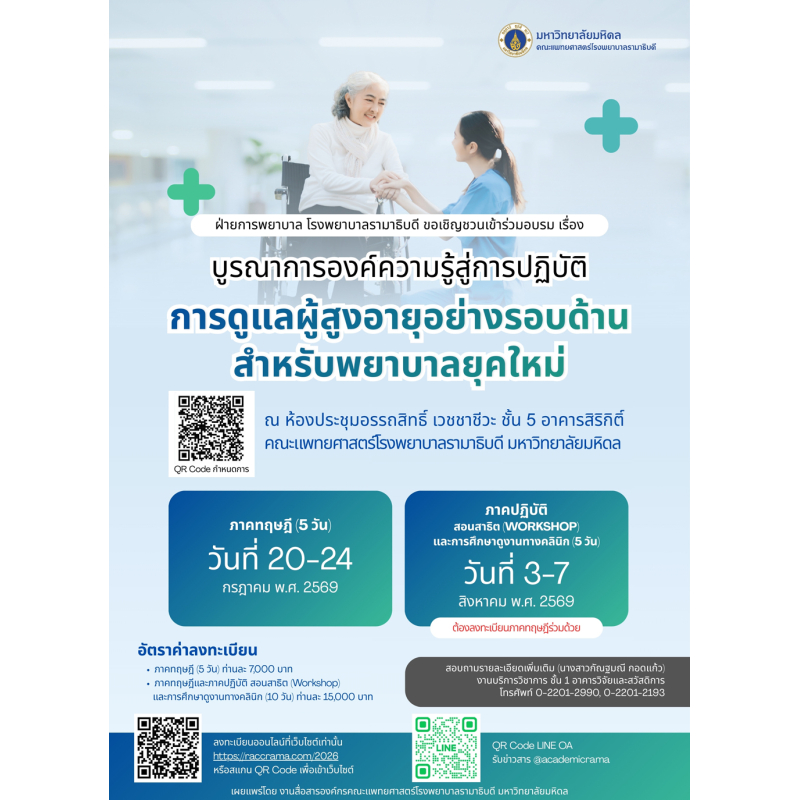 (ลงทะเบียนระบบใหม่) โครงการอบรมเชิงปฏิบัติการ "บูรณาการองค์ความรู้สู่การปฏิบัติ : การดูแลผู้สูงอายุอย่างรอบด้าน สำหรับพยาบาลยุคใหม่" (หลักสูตร 10 วัน)