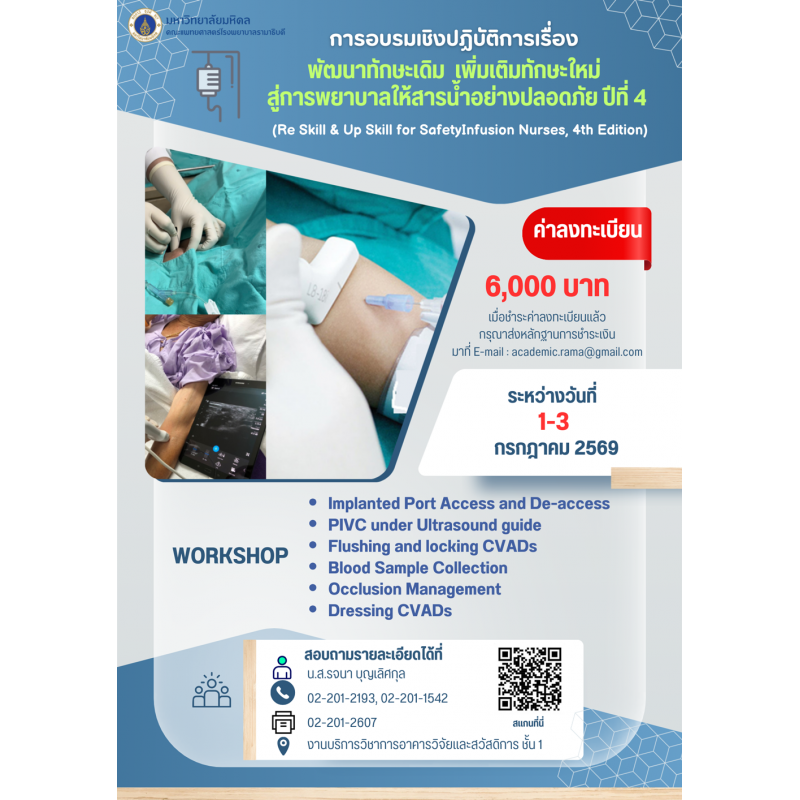 โครงการอบรมเชิงปฏิบัติการ เรื่อง “พัฒนาทักษะเดิม เพิ่มเติมทักษะใหม่ สู่การพยาบาลให้สารน้ำอย่างปลอดภัย ปีที่ 4” (Re Skill & Up Skill for Safety Infusion Nurses, 4th Edition)