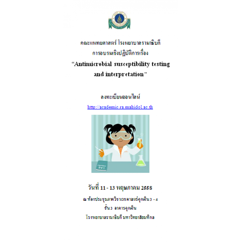 เป็นที่ทราบกันโดยทั่วไปว่า ปัญหาหลักของการสาธารณสุขของประเทศด้านหนึ่งคือปัญหาโรคติดเชื้อ ที่ครอบคลุมเชื้อแบคทีเรีย เชื้อรา เชื้อไวรัส รวมทั้งปรสิตต่างๆ ซึ่งการวิวัฒนาการของเชื้อก่อโรคเหล่านี้มีความรวดเร็วเท่าทันความก้าวหน้าทางเทคโนโลยีด้านการแพทย์ ดังที่จะเห็นได้จากการเกิดขึ้นของเชื้อก่อโรคอุบัติใหม่และอุบัติซ้ำ (Emerging and re-emerging infectious diseases) อยู่เป็นระยะๆ ดังนั้นนอกเหนือจากกระบวนการวินิจฉัยเชื้อก่อโรคต่างๆที่ถูกต้อง รวดเร็วแล้ว ผลการทดสอบความไวต่อสารต้านจุลชีพ (antimicrobial susceptibility) ที่เหมาะสม แม่นยำ จะมีส่วนสำคัญที่ช่วยให้แพทย์พิจารณาเลือกยาปฏิชีวนะในการรักษาได้อย่างมีประสิทธิภาพสูงสุด ในการนี้หน่วยจุลชีววิทยา ภาควิชาพยาธิวิทยา เล็งเห็นถึงความสำคัญในการที่จะเพิ่มศักยภาพของบุคลากรที่ปฏิบัติงานด้านจุลชีววิทยาในห้องปฏิบัติการของสถานพยาบาลต่างๆทั่วประเทศ จึงจัดให้มีการฝึกอบรมนี้ขึ้น เพื่อให้สามารถนำความรู้ที่ได้ไปปฏิบัติได้จริงในงาน