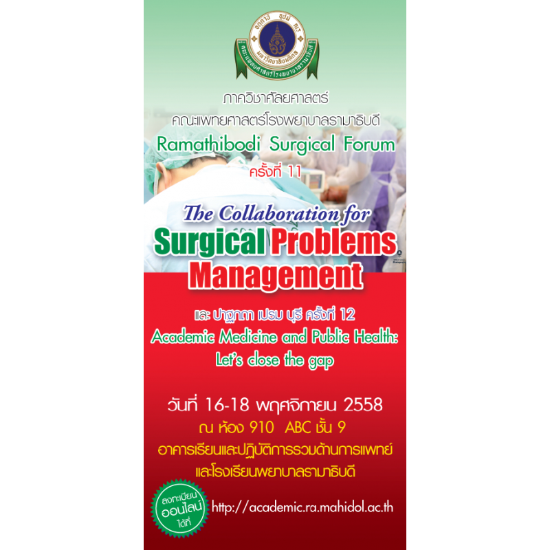 การผ่าตัดเพื่อการรักษาโรคเป็นหนึ่งในการบริการดูแลรักษาผู้ป่วยที่อาจได้รับการบาดเจ็บ หรือโรคภัยไข้เจ็บ ที่ต้องอาศัยการทำงานของศัลยแพทย์ วิสัญญีแพทย์และพยาบาลห้องผ่าตัดอย่างมีคุณภาพ และเพื่อให้เกิดคุณภาพอย่างชัดเจน การพัฒนาองค์ความรู้ของศัลยแพทย์ซึ่งมีการเปลี่ยนแปลงอย่างต่อเนื่อง และมีการประยุกต์ใช้องค์ความรู้เหล่านั้นให้สอดคล้องกับบริบทในระบบบริการดูแลรักษาผู้ป่วย ดังนั้น ภาควิชาศัลยศาสตร์ คณะแพทยศาสตร์โรงพยาบาลรามาธิบดี มหาวิทยาลัยมหิดล ได้จัดโครงการให้ความรู้ต่อเนื่อง (continuous medical education) ให้แก่เหล่า แพทย์ประจำบ้าน แพทย์ประจำบ้านต่อยอด ศัลยแพทย์ แพทย์ทั่วไป พยาบาล ตลอดจนบุคลากรทางด้านสาธารณสุข ได้รับความรู้นี้ที่มีการพัฒนาอย่างต่อเนื่อง สามารถนำไปประยุกต์ใช้ให้เหมาะสมกับระบบบริการดูแลรักษาผู้ป่วยที่หลากหลายได้อย่างมีคุณภาพ เพื่อประโยชน์สูงสุดแก่ประชาชนชาวไทย และประเทศชาติต่อไป โครงการให้ความรู้ต่อเนื่อง (continuous medical education) ให้แก่เหล่า แพทย์ประจำบ้าน แพทย์ประจำบ้านต่อยอด ศัลยแพทย์ แพทย์ทั่วไป พยาบาล ตลอดจนบุคลากรทางด้านสาธารณสุขใน ปีนี้เป็นการจัดงาน Ramathibodi Surgical Forum ครั้งที่ 11 และ ปาฐกถา เปรมบุรี ครั้งที่ 12 ซึ่งได้กำหนดหัวข้อการประชุม “The Collaboration for Surgical Problems Management” ให้สอดคล้องกับบริบทในระบบบริการดูแลรักษาผู้ป่วยที่จำเป็นต้องได้รับการผ่าตัดรักษาพยาบาล นับว่าเป็นการประชุมวิชาการอย่างเป็นทางการเพื่อเป็นการพัฒนาองค์ความรู้ที่น่าสนใจ อันจะเกิดประโยชน์ไม่เฉพาะต่อศัลยแพทย์เท่านั้น แต่จะเกิดประโยชน์อย่างยิ่งต่อบุคคลากรที่ต้องปฏิบัติงานร่วมกันใน ห้องผ่าตัดทั้งก่อนและหลังการผ่าตัดอีกด้วย