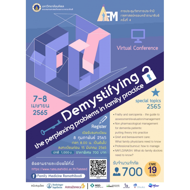 จัดประชุมวันที่ ๗ - ๘ เมษายน ๒๕๖๕ รูปแบบออนไลน์ กลุ่มเป้าหมาย: แพทย์เวชศาสตร์ครอบครัว แพทย์เวชปฏิบัติทั่วไป บุคลากรทางการแพทย์และสาธารณสุข จำนวนประมาณ ๗๐๐ คน ค่าลงทะเบียน