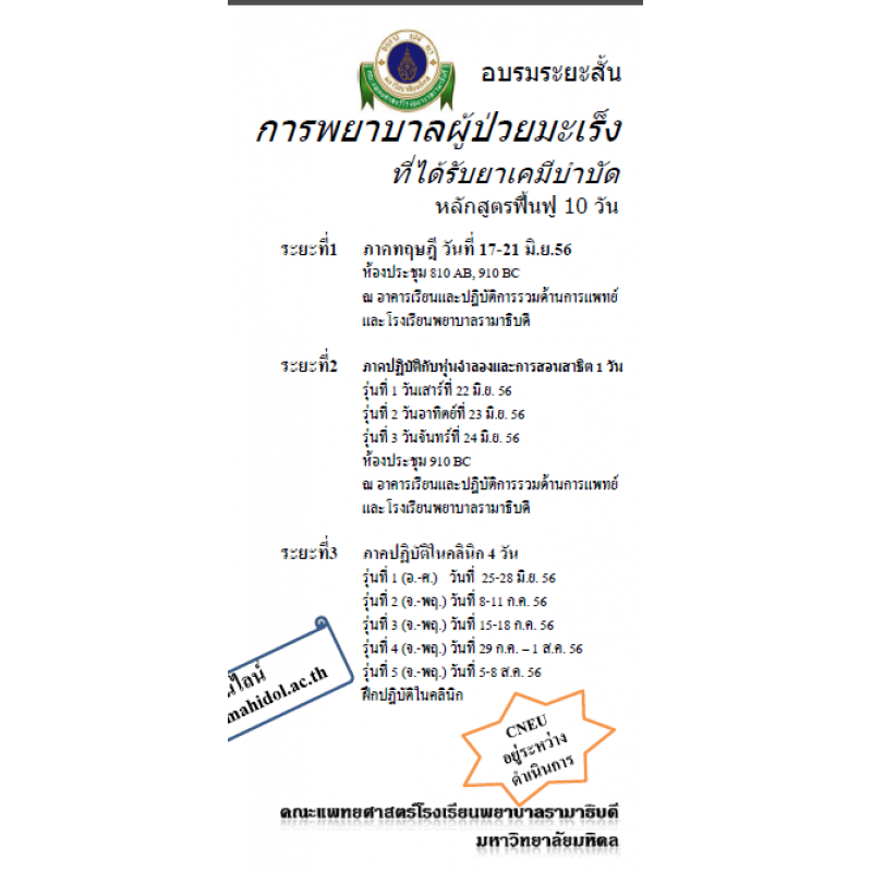 ฝ่ายการพยาบาล คณะแพทยศาสตร์โรงพยาบาลรามาธิบดี มหาวิทยาลัยมหิดล ได้ตระหนักถึงความสำคัญในการพยาบาลผู้ป่วยมะเร็งที่ได้รับยาเคมีบำบัด จึงได้จัดทำโครงการฝึกอบรมระยะสั้น การพยาบาลผู้ป่วยมะเร็งที่ได้รับยาเคมีบำบัดขึ้นเพื่อฝึกอบรมพยาบาลที่ทำงานในหน่วยงานที่เกี่ยวข้องกับผู้ป่วยมะเร็งที่ได้รับยาเคมีบำบัดให้มีความรู้และทักษะในการพยาบาล เพื่อนำไปประยุกต์ใช้ในการทำงานได้อย่างมีประสิทธิภาพ รวมทั้งมีแนวคิดในการติดตามและปรับปรุงแนวปฏิบัติที่เป็นมาตรฐานของสถานบริการหรือโรงพยาบาลนั้นๆ และคาดว่าจะเกิดรูปแบบการติดตามประเมินผลลัพธ์ทางการพยาบาล เพื่อคงไว้ซึ่งมาตรฐานการพยาบาลผู้ป่วยมะเร็งที่ได้รับยาเคมีบำบัด