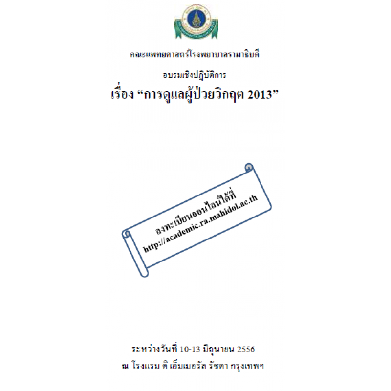 ฝ่ายการพยาบาล คณะแพทยศาสตร์ โรงพยาบาลรามาธิบดี จึงจัดการอบรมเชิงปฏิบัติการการดูแลผู้ป่วยวิกฤต 2013 ขึ้นเพื่อให้พยาบาลวิชาชีพที่ปฏิบัติงานในหอผู้ป่วยวิกฤต และหอผู้ป่วยหนักได้เพิ่มพูนความรู้ความสามารถ ในการให้การดูแลผู้ป่วยวิกฤตได้อย่างถูกต้องและปลอดภัย