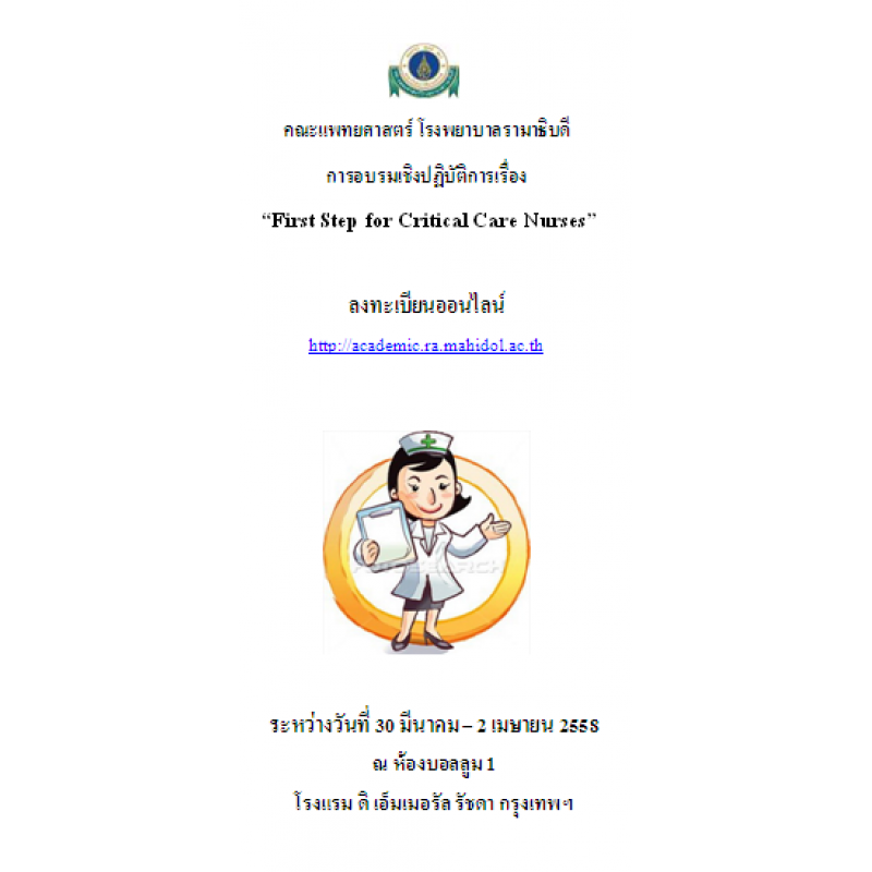 ฝ่ายการพยาบาล คณะแพทยศาสตร์ โรงพยาบาลรามาธิบดี จึงจัดการอบรมเชิงปฏิบัติการเรื่อง“Start as Critical Care Nurses” ขึ้นเพื่อให้ความรู้แก่พยาบาลวิชาชีพที่จบใหม่หรือพยาบาลที่มีความสนใจที่จะปฏิบัติงานในหอผู้ป่วยวิกฤต ได้เพิ่มพูนความรู้ความสามารถ ในการให้การดูแลผู้ป่วยวิกฤตได้อย่างถูกต้องและปลอดภัย