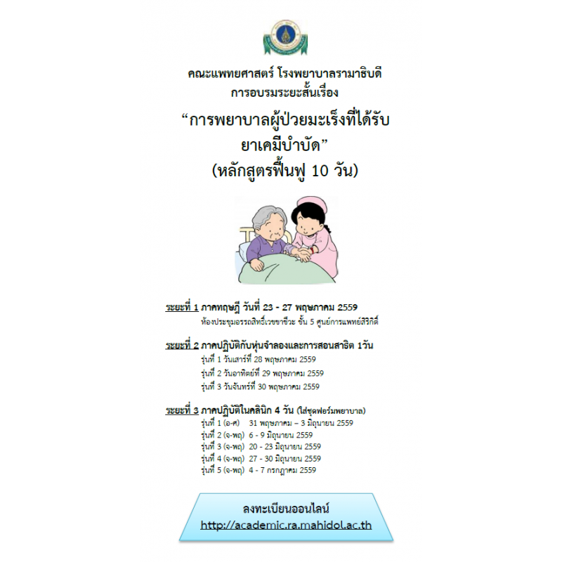 ฝ่ายการพยาบาล คณะแพทยศาสตร์โรงพยาบาลรามาธิบดี มหาวิทยาลัยมหิดล ได้ตระหนักถึงความสำคัญในการพยาบาลผู้ป่วยมะเร็งที่ได้รับยาเคมีบำบัด จึงได้จัดทำโครงการฝึกอบรมระยะสั้น การพยาบาลผู้ป่วยมะเร็งที่ได้รับยาเคมีบำบัดขึ้น เพื่อฝึกอบรมพยาบาลที่ทำงานในหน่วยงานที่เกี่ยวข้องกับผู้ป่วยมะเร็ง ให้มีความรู้และทักษะในการพยาบาล นำความรู้ไปประยุกต์ใช้ในการทำงานได้อย่างมีประสิทธิภาพ รวมทั้งมีแนวคิดปรับปรุง แนวปฏิบัติที่เป็นมาตรฐานของสถานบริการหรือโรงพยาบาลนั้นๆ