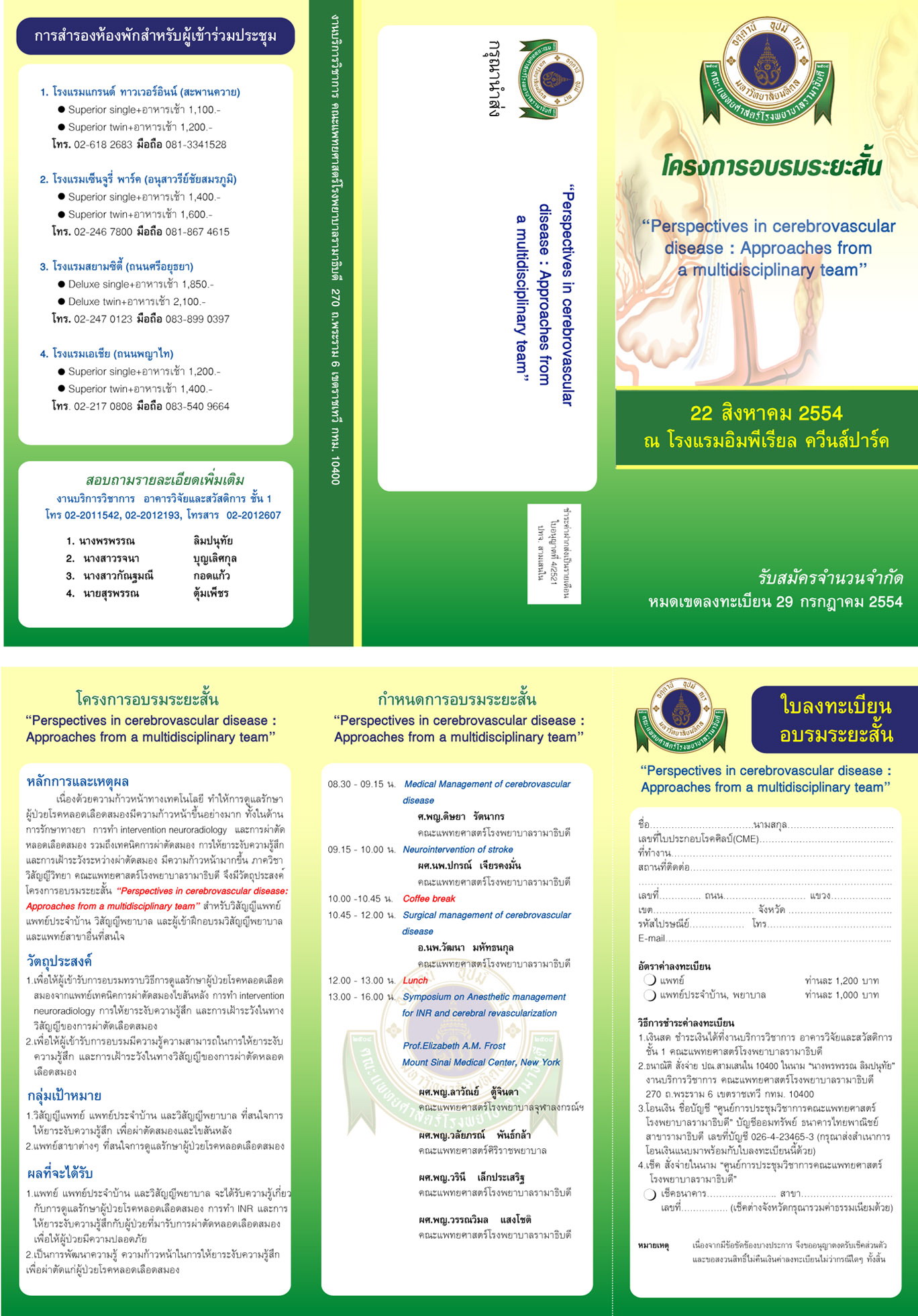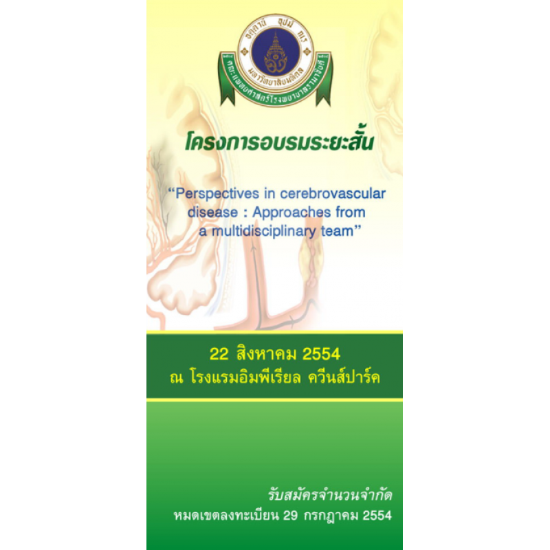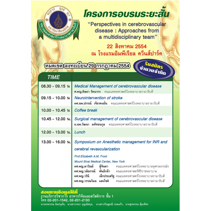 เนื่องด้วยความก้าวหน้าทางเทคโนโลยี ทำให้การดูแลรักษาผู้ป่วยโรคหลอดเลือดสมองมีความก้าวหน้าขึ้นอย่างมาก ทั้งในด้านการรักษาทางยา การทำ intervention neuroradiology และการผ่าตัดหลอดเลือดสมอง รวมถึงเทคนิคการผ่าตัดสมอง การให้ยาระงับความรู้สึกและการเฝ้าระวังระหว่างผ่าตัดสมอง มีความก้าวหน้ามากขึ้น ภาควิชาวิสัญญีวิทยา คณะแพทยศาสตร์โรงพยาบาลรามาธิบดี จึงมีวัตถุประสงค์โครงการอบรมระยะสั้น “Perspectives in cerebrovascular disease: Approaches from a multidisciplinary team” สำหรับวิสัญญีแพทย์ แพทย์ประจำบ้าน วิสัญญีพยาบาล และผู้เข้าฝึกอบรมวิสัญญีพยาบาล และแพทย์สาขาอื่นที่สนใจ